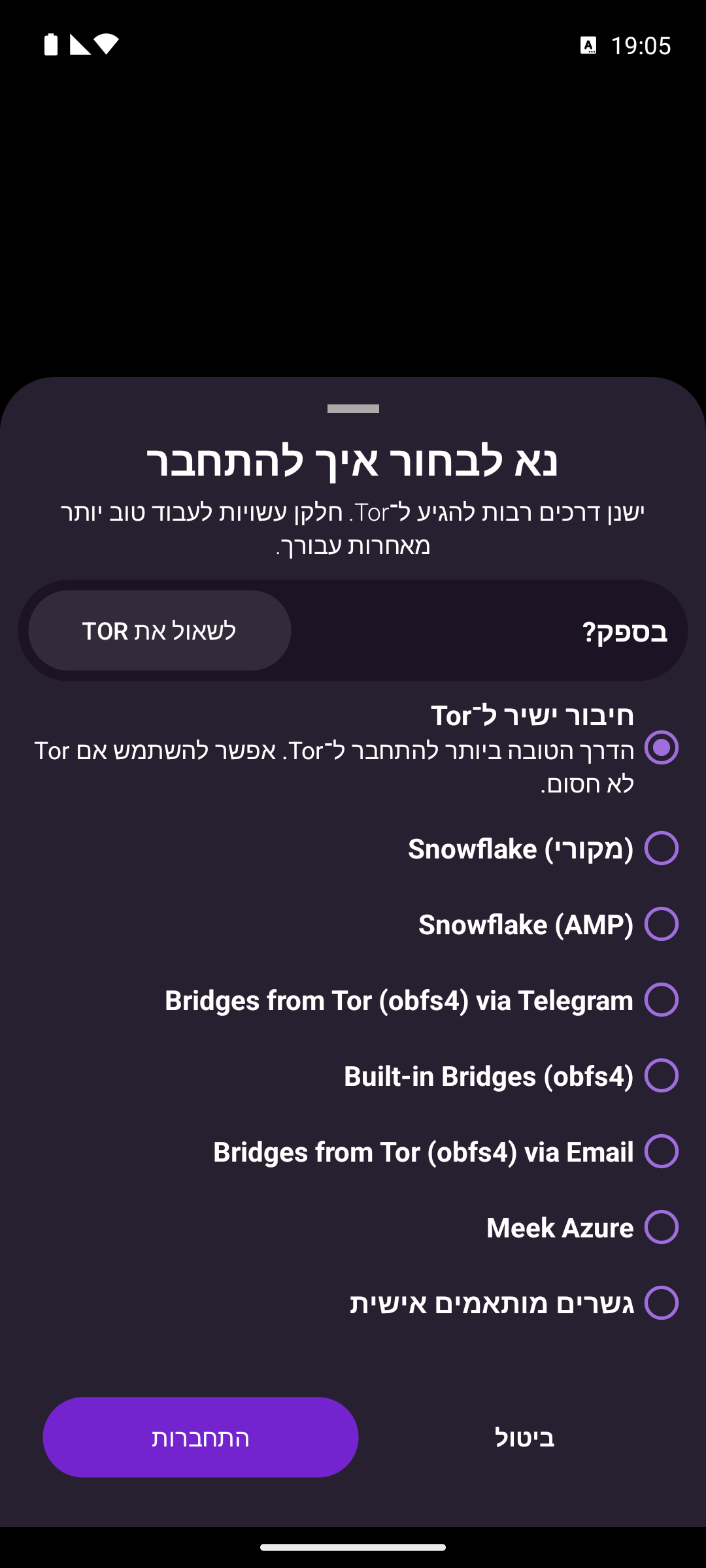 Orbot offers access to a variety of Tor Bridges, so you can stay connected even on the most restricted networks