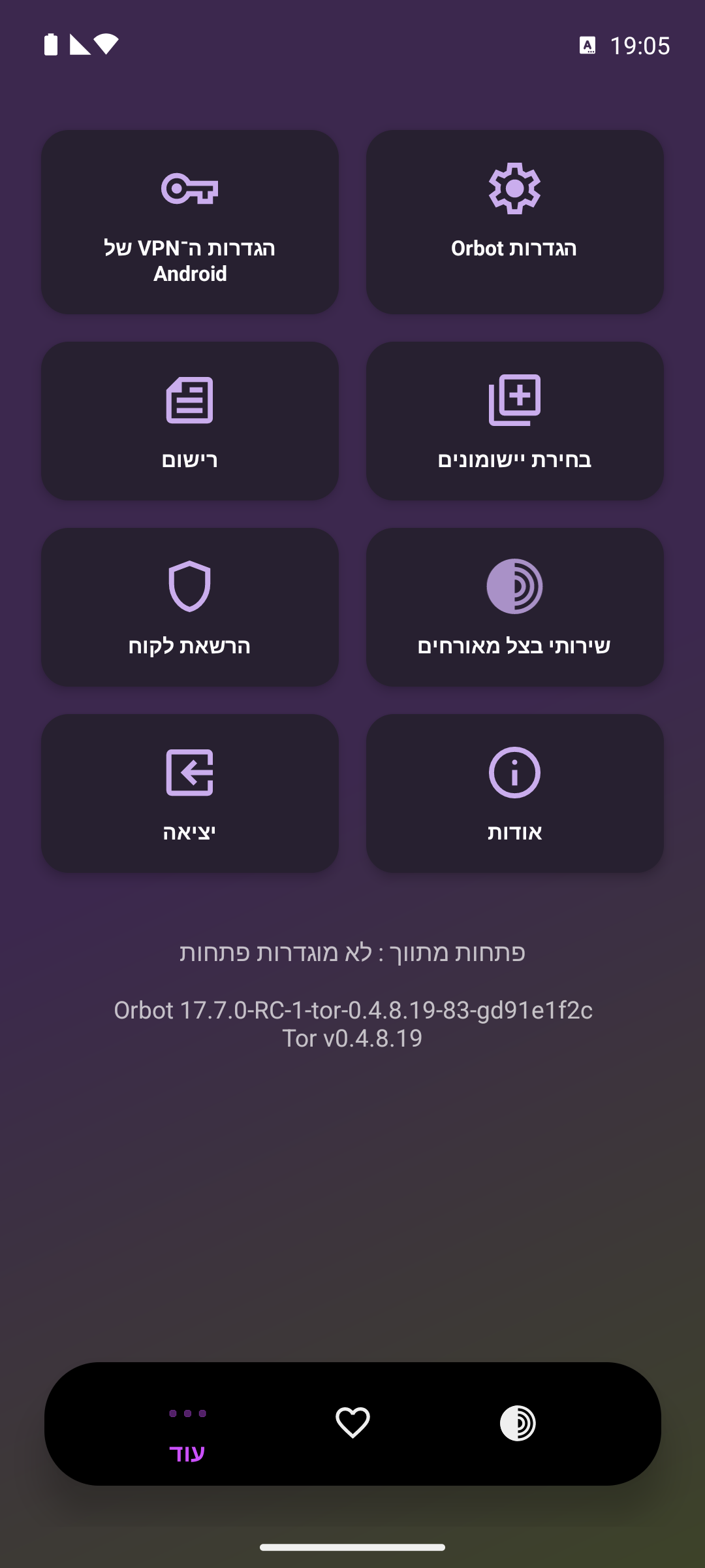 Follow @GuardianProjectאורבוט הוא יישום חינמי! תמכו בפיתוח המתמשך של היישום. שתפו באהבה.
